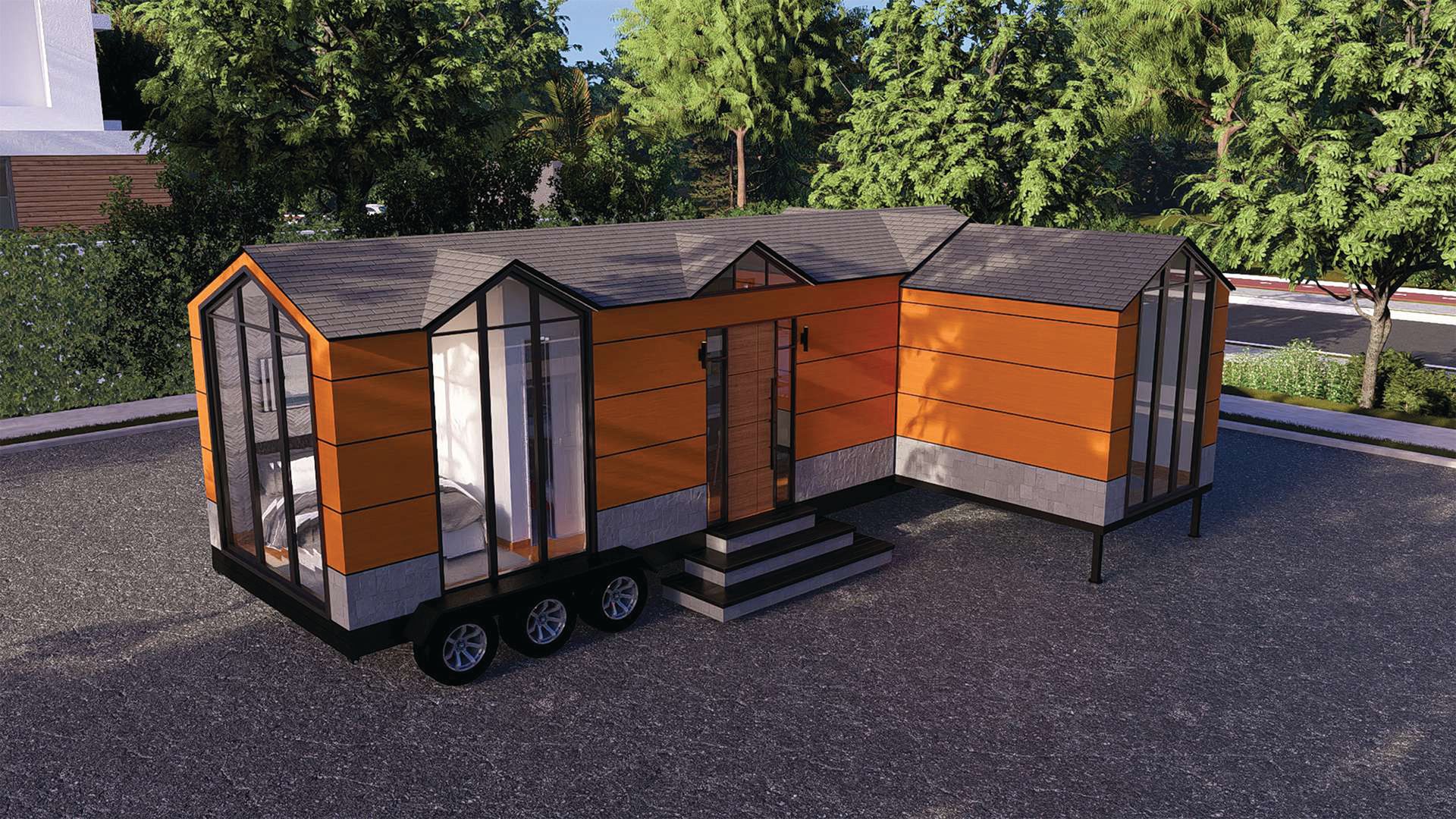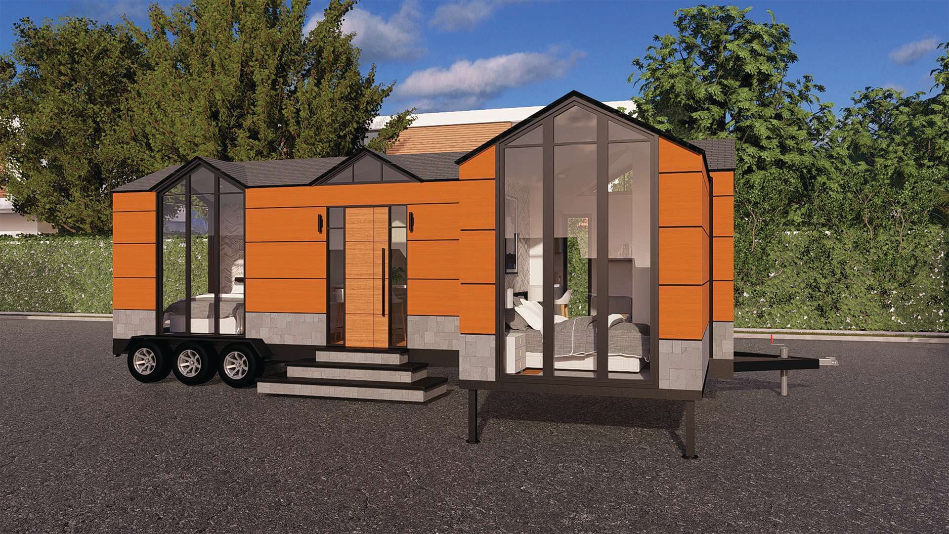 The standout feature of the Bella Vista is how much it transforms when fully expanded. That, and the sleek glass elevator that takes you upstairs to the natural-light-filled bedroom! The Bella Vista is perfect for those who enjoy outdoor living, as a 5’ by 9’ deck allows for comfy outdoor seating. Bump-outs with floor-to-ceiling windows add space for a home office area, a seating area, and a gorgeous solarium.
