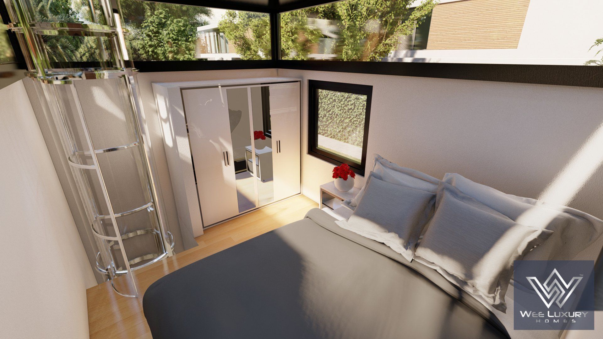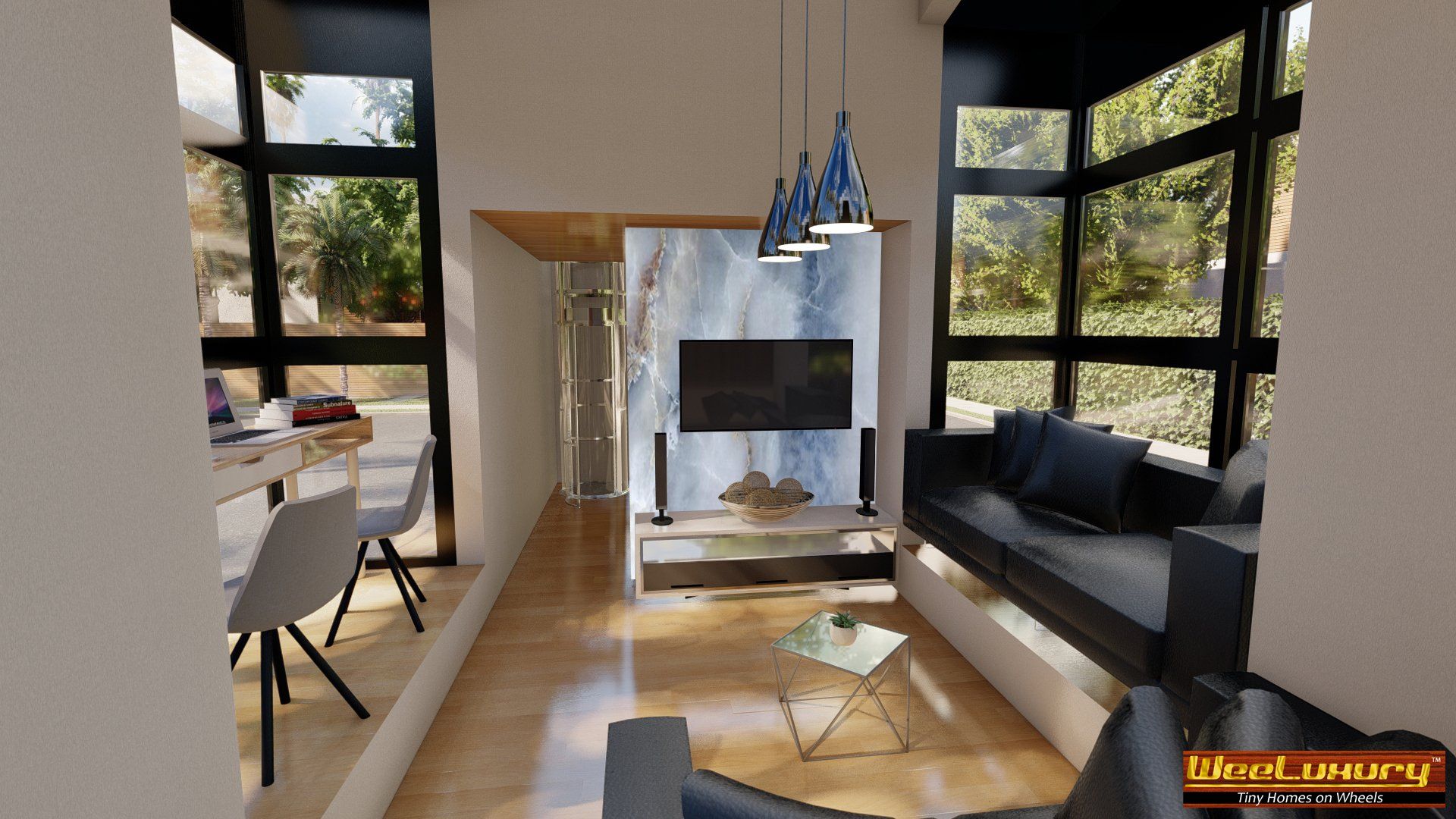 The standout feature of the Bella Vista is how much it transforms when fully expanded. That, and the sleek glass elevator that takes you upstairs to the natural-light-filled bedroom! The Bella Vista is perfect for those who enjoy outdoor living, as a 5’ by 9’ deck allows for comfy outdoor seating. Bump-outs with floor-to-ceiling windows add space for a home office area, a seating area, and a gorgeous solarium.