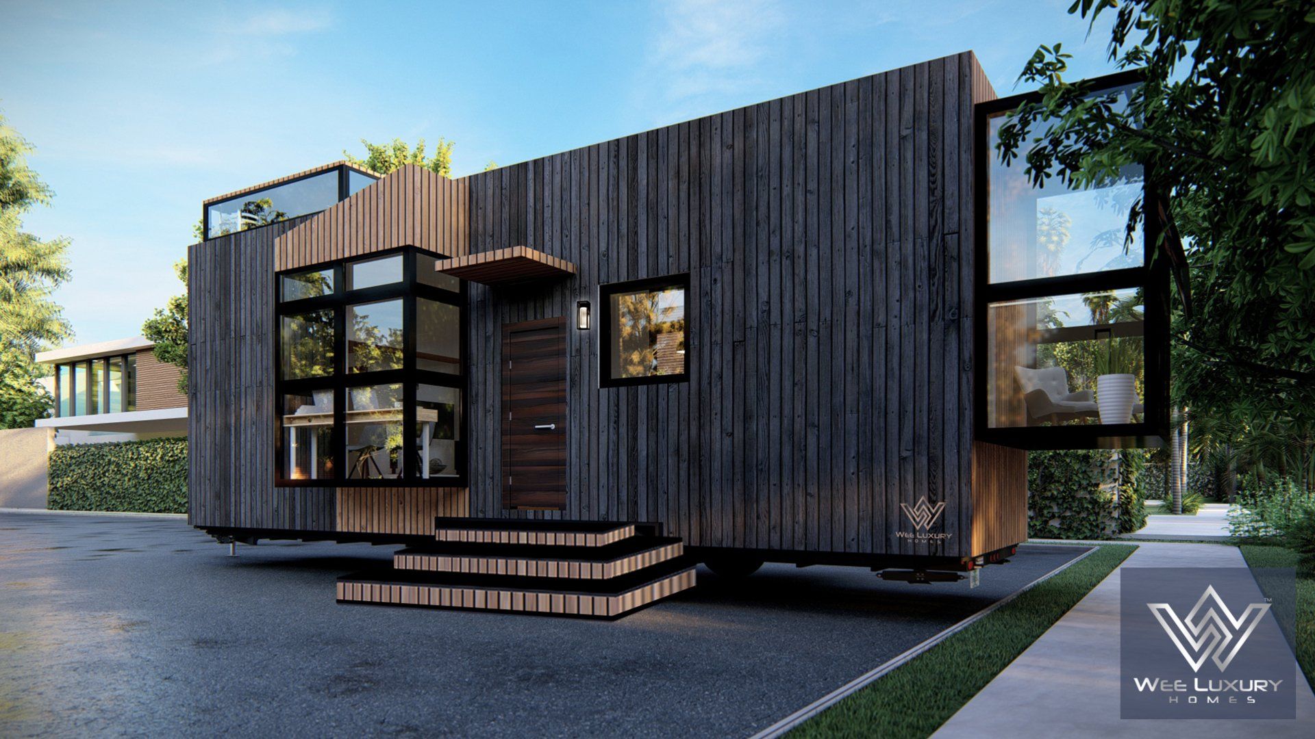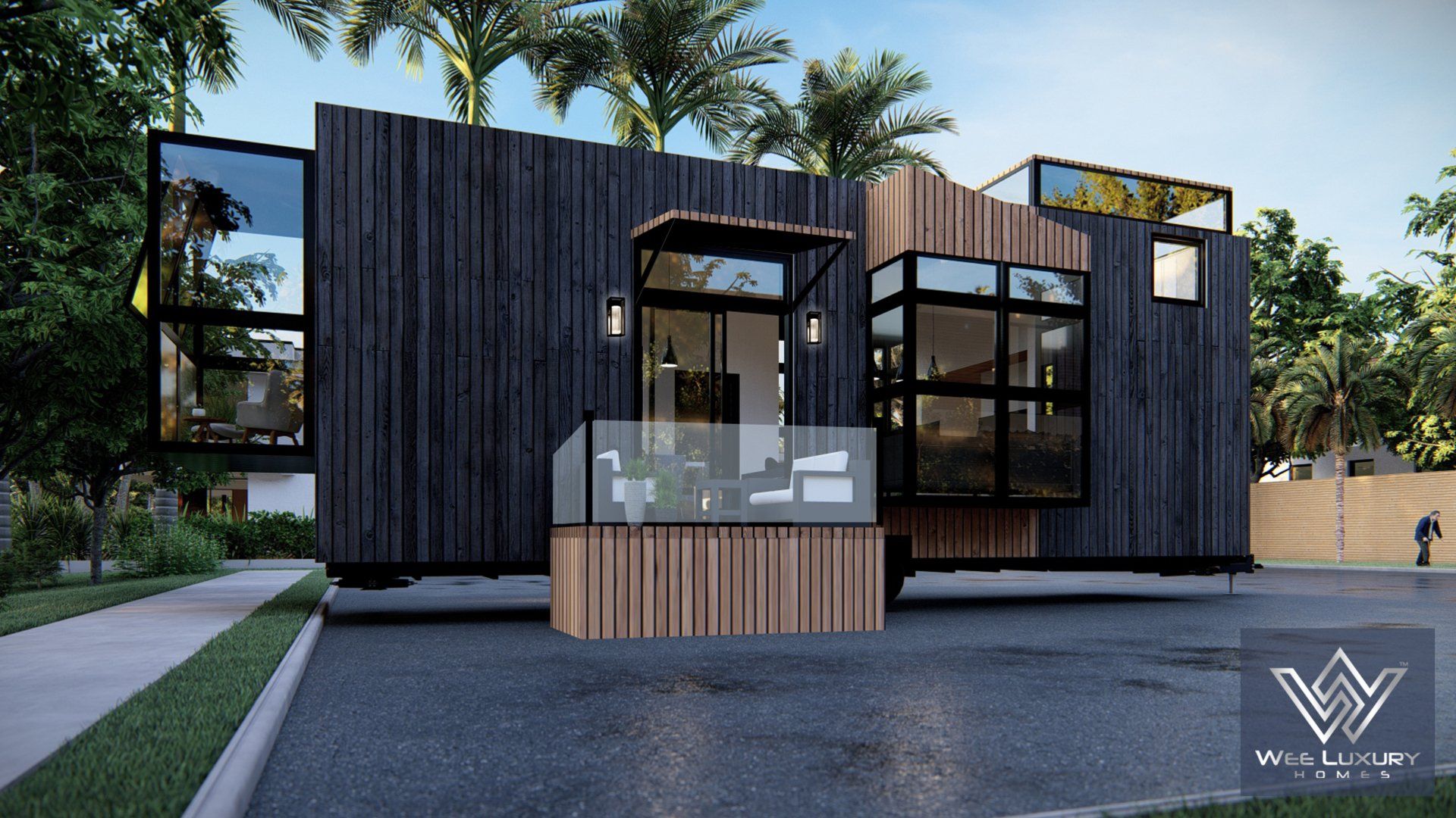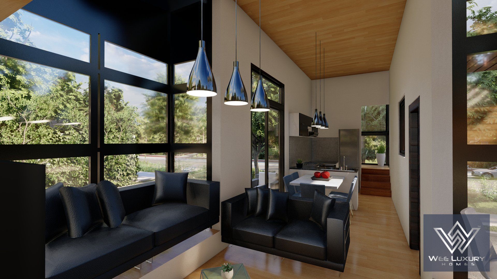 The Bella Vista incorporates the hallmarks of modern design like natural materials, large windows, and clean, straight lines. Inside, an elegant black-and-white color palette keeps everything feeling spacious. Sleek modern cabinetry and lighting make this tiny home feel luxurious while warm wood floors and ceilings keep it feeling cozy.